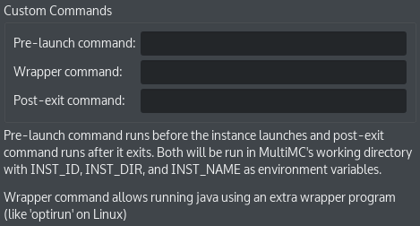 Both will be run in MultiMC's working directory with INST_ID, INST_DIR, and INST_NAME as environment variables.
